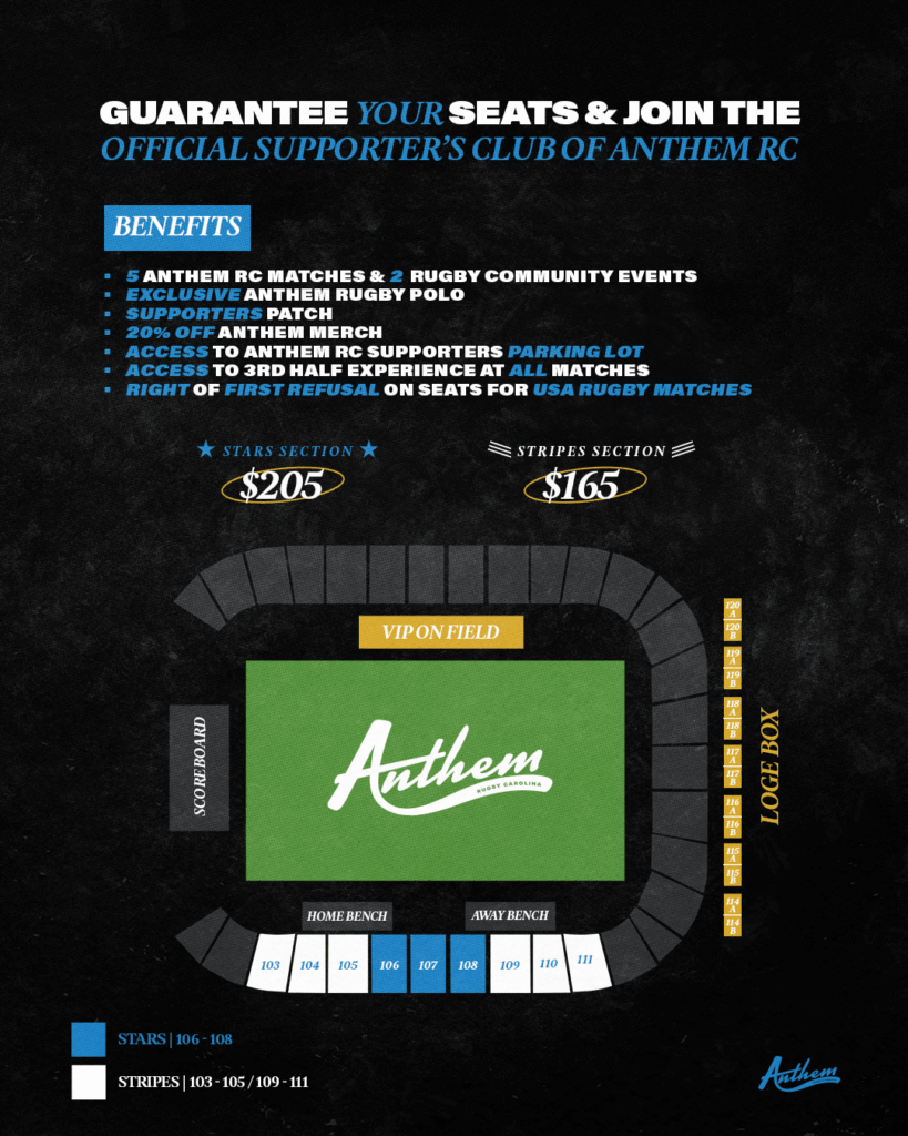 Lock in all 5 home matches for Anthem Rugby Carolina! Not only will you receive the best price per match, but you’ll also enjoy EXCLUSIVE season ticket member perks. Secure your 2026 Season Ticket Membership today!