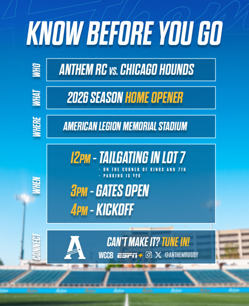This is Anthem RC’s first home match of the 2026 season — the first chance for Charlotte to see this transformed squad in person and get behind a team that finally knows what winning feels like. American Legion Memorial Stadium on a Saturday afternoon. After what happened in Irvine, you’ll want to be there.
